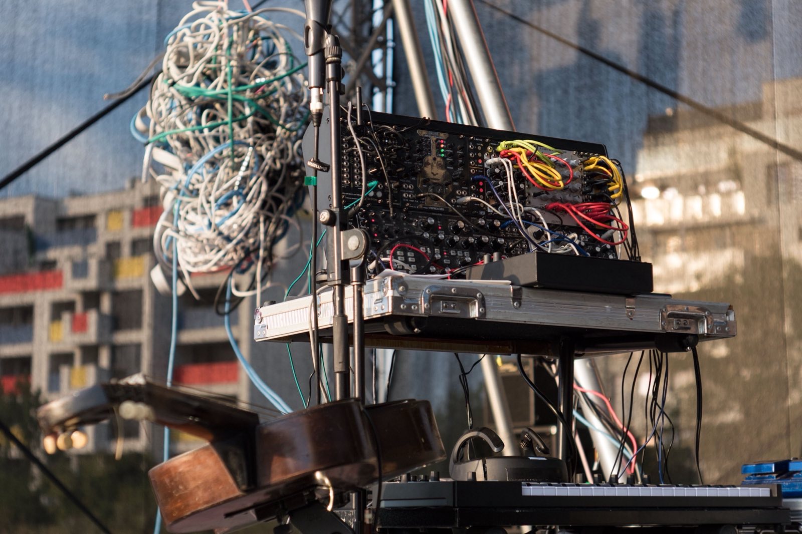 The performance apparatus explores the symbiotic yet contradictory relationship between the human body and technology. It examines the process of mutual mobilization and questions the pleasurable moment of control and the being controlled. A neuronal interface is located on the head of the performer – this converts streams of thoughts into sound. The wrists and the belly are equipped with two highly sensitive vector sensors. Digital technology processes movements and controls the sounds of a modular synthesizer. Analog cables become aerial prop, an acoustic guitar becomes a multi-layered body of sound. The choreography is inspired by the sonic textures created by the modular synthesis.