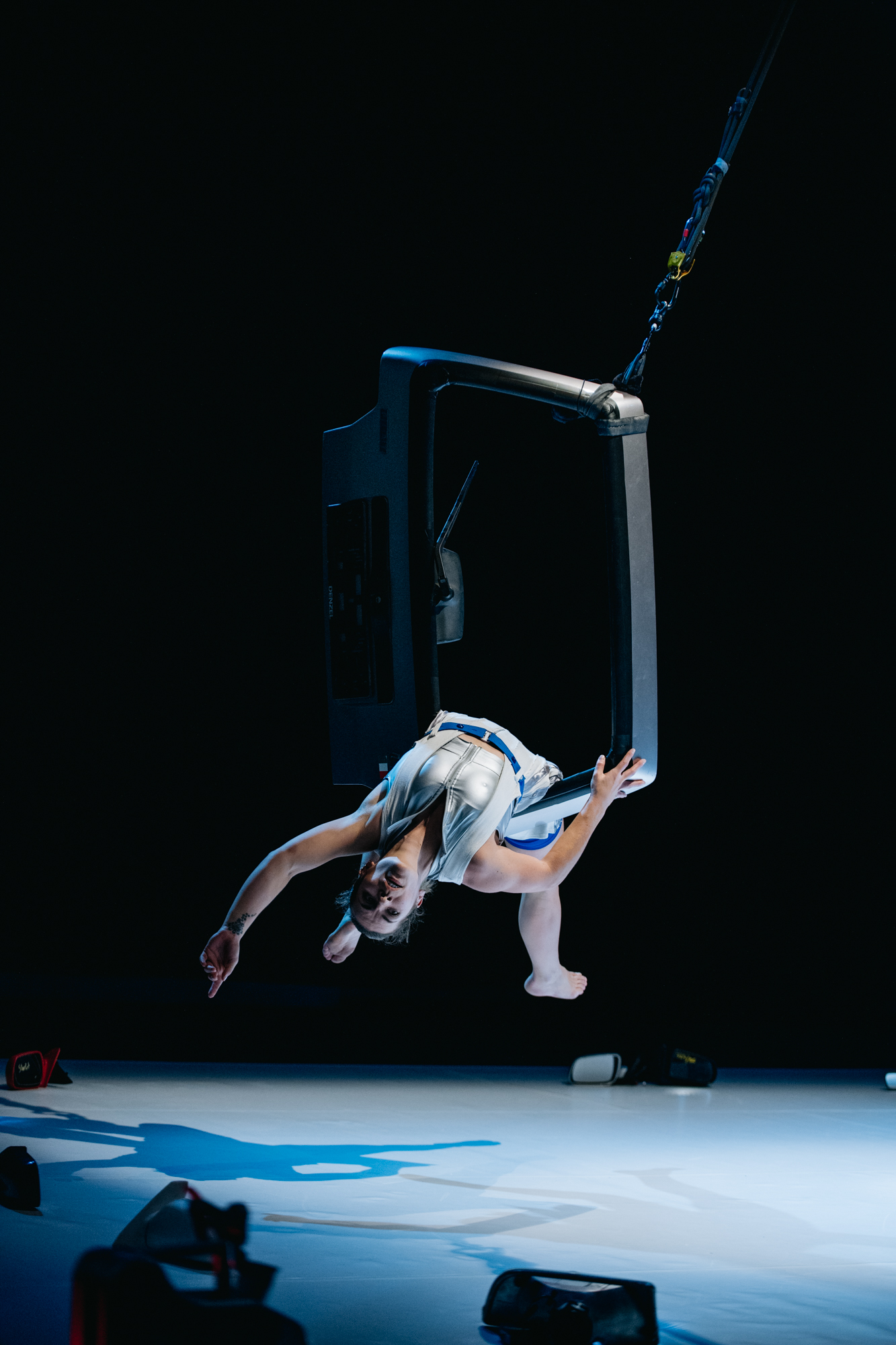 Tanja Peinsipp explores the question of how desire and letting go relate to the object of the car. She measures her body against the tailgate, tests positions, positions herself in relation to it, touches it, holds on to it, and carries it. Drivers like to attribute their own character traits to their cars, giving them nicknames. Where can so-called “car feelings” be found? Is car tuning and car care a form of love affair between humans and metal bodies? The deconstructed object of a tailgate, through its former connection to the automobile, brings with it various associations, desires, and problems. In heck A CARe LESS WORK, ecofeminism meets contemporary circus. Through aerial artistry, object manipulation, and dance, the emotional relationship with the metal body is subversively questioned. The performer asks herself how cars can be discussed from a feminist perspective in the 21st century.