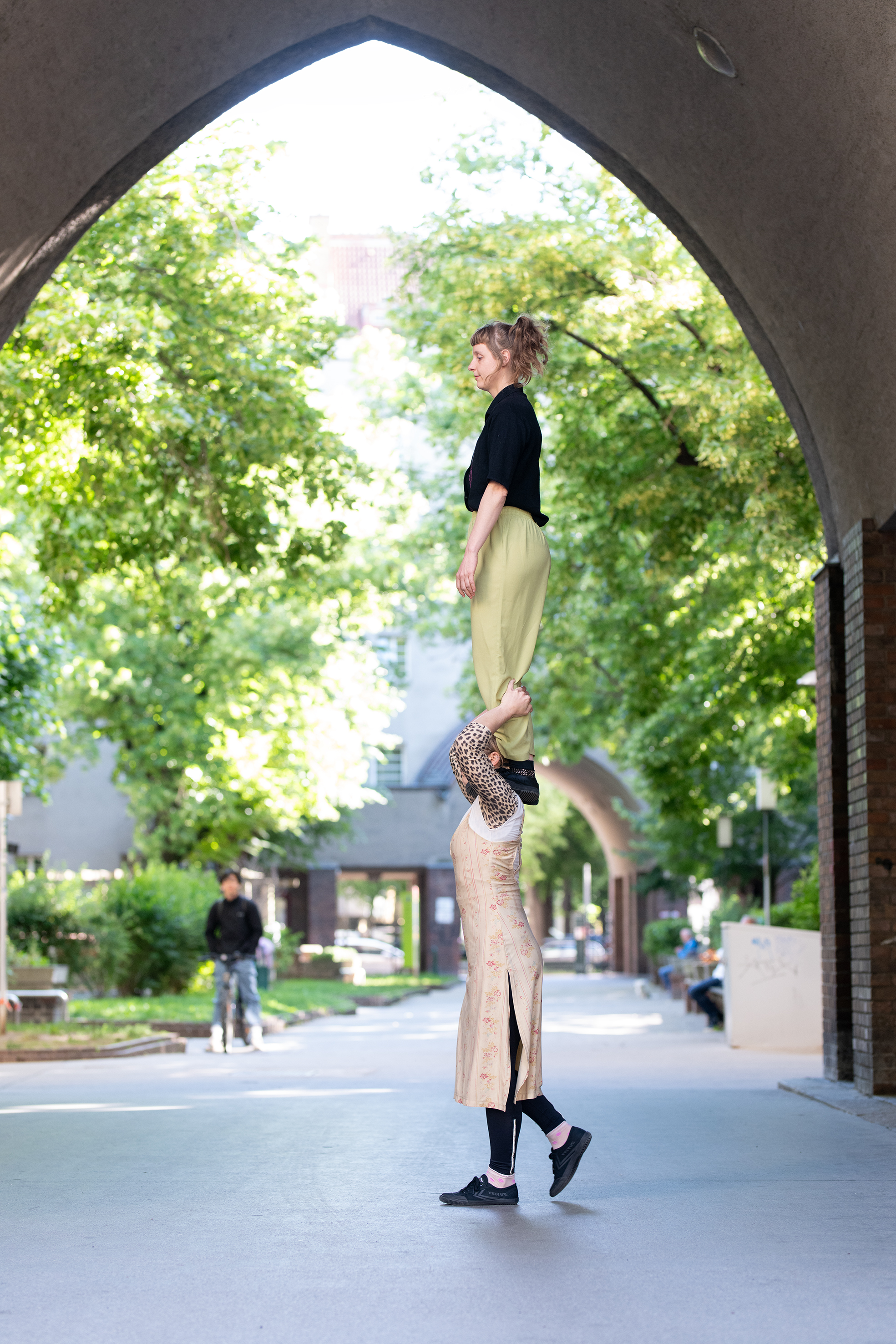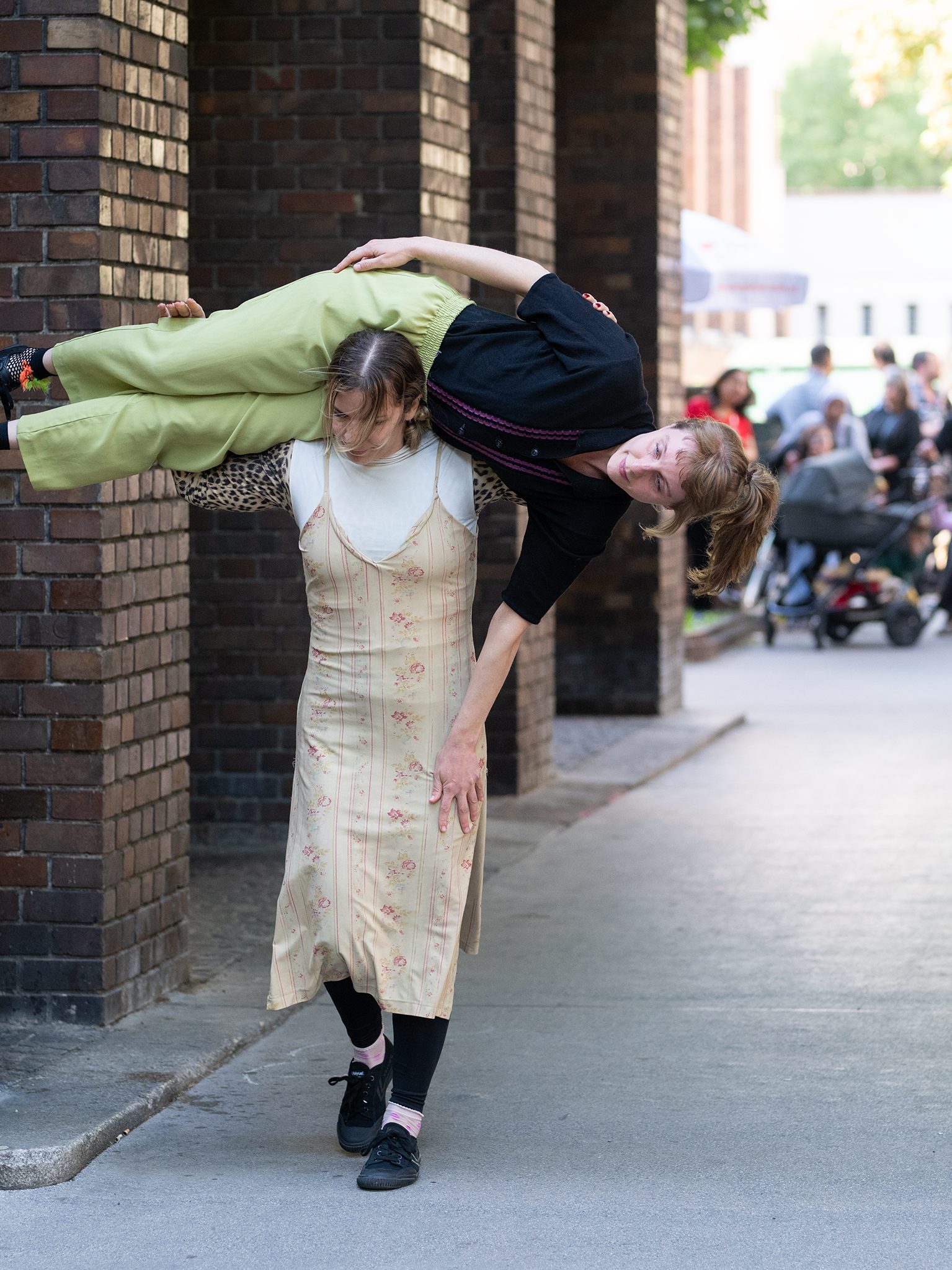The artists place their bodies in relation to the structural conditions of the Rabenhof and trace the atmosphere of the inner courtyards. A Christmas tree decorated with Easter eggs, opposing balconies, concave shapes and snippets of conversation recorded between the residents as they pass by, found objects are used to create choreographies in the communal building.