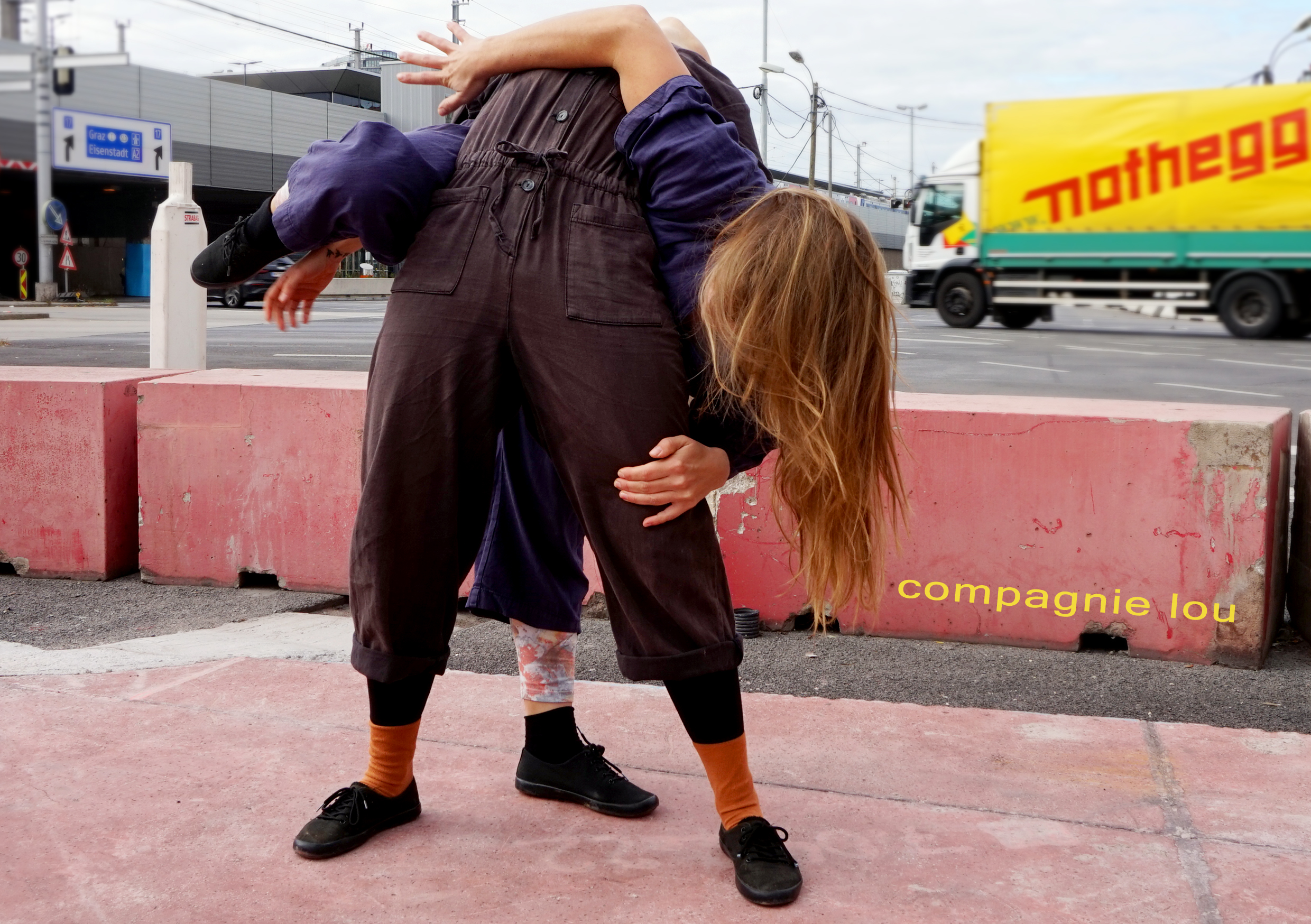 Die sich ineinander verknoteten Körper stehen mal diametral zum Bewegungsfluss des Autoverkehrs, mal scheinen sie mit ihm zu fließen. Verharrt in einem Knoten, stützend, haltend, weich, beobachtend, machen die beiden Performerinnen mit radikaler Zärtlichkeit auf die Möglichkeiten einer feministischen Aneignung dieses Ortes aufmerksam.