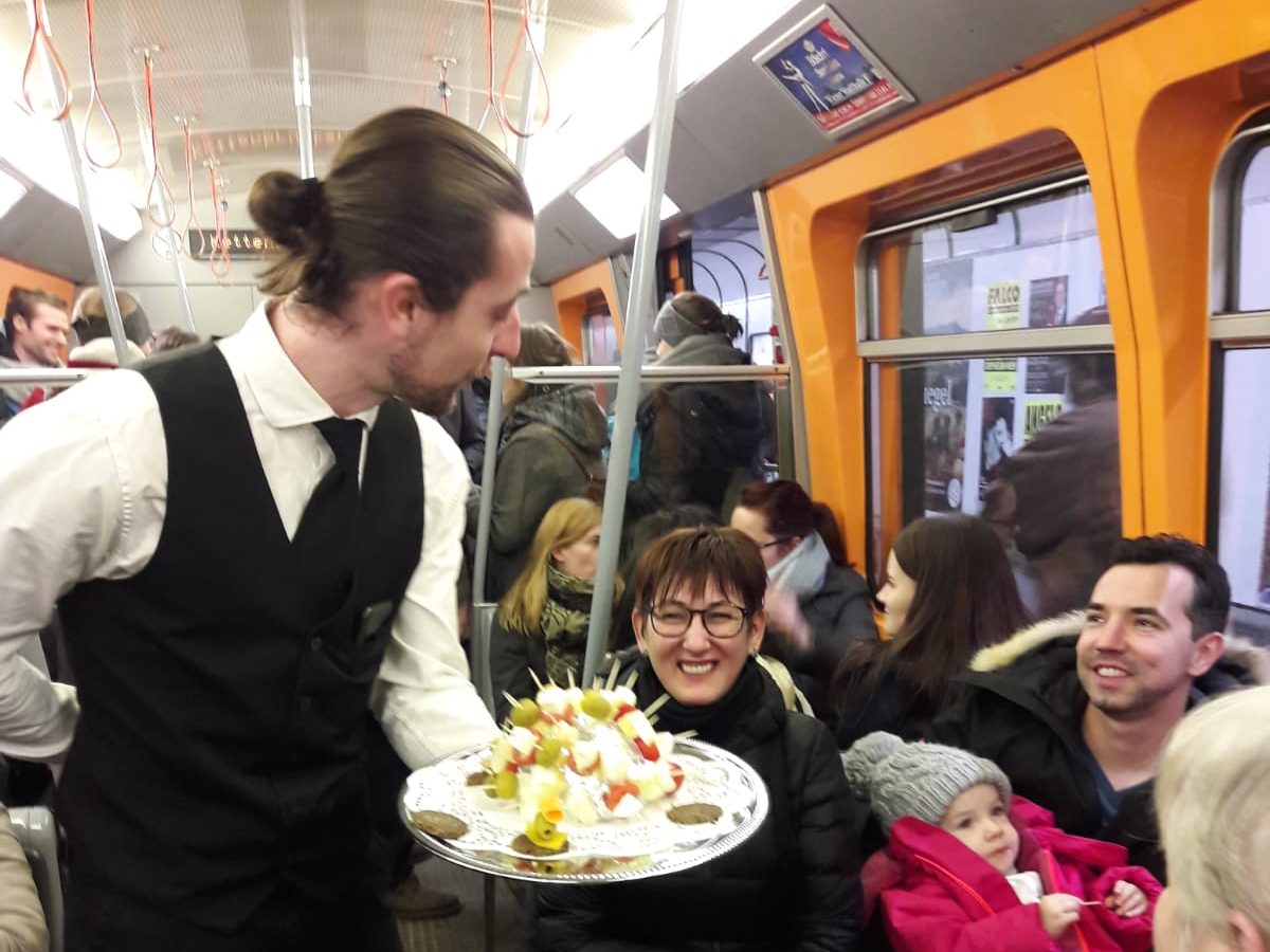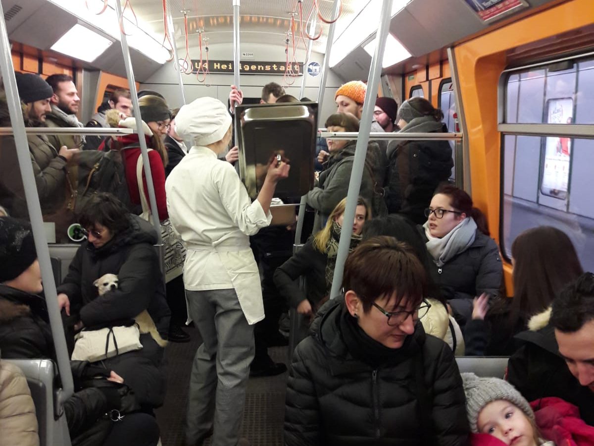 Ein ganzes Abteil der U4 wird für einige Stationen von der Gruppe Franz bespielt und schafft einen kurzen Zwischenraum, in welchem hinzugestiegen, bereits sitzende Fahrgäste sich mitten im festlichen letzten Dinner in der U-Bahn befinden. Geboten wird ein wunderbarer Empfang in der U4 mit dem Startpunkt Margaretengürtel, an welchem einige geladene Festgäste bereits herausgeputzt warten, um in der U Bahn nochmal richtig zu dinieren, genüßlich, leidenschaftlich im kleinen Kreise. Dazu eingeladen ist jede Person die sich im selben Abteil befinden. Wer steigt ein? Wer tanzt mit und wann kommt eigentlich der Hauptgang serviert von unserer Starköchin? Das Zelebrieren des gemeinsamen Essen innerhalb eines öffentlichen Verkehrsmittels, lädt zur Interaktion zwischen den Fahrenden ein und verwandelt den Ort temporär in einen Raum der Zusammenkunft.